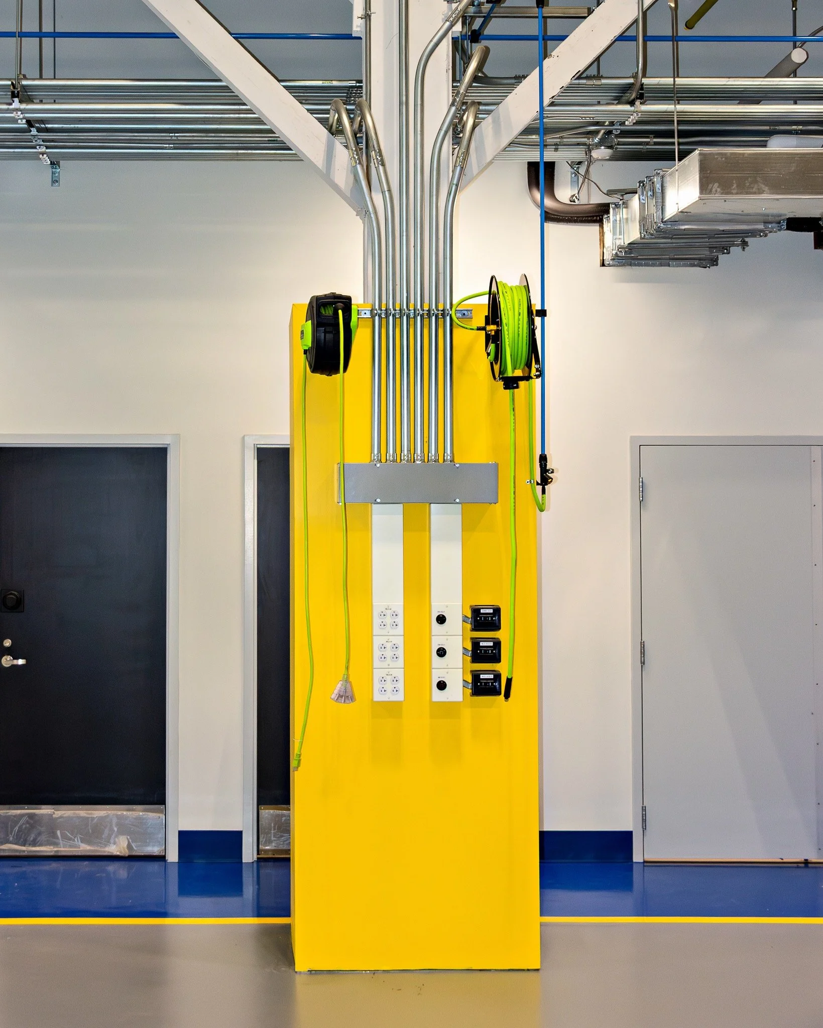 Renovation of turn of the century Mill Building. The project consisted of new digitally controlled lighting, mechanical equipment including a dedicated outdoor air system, VRF heating and cooling, and major electrical distribution to support multiple cell work areas. The existing electrical infrastructure was removed, and a new EMT distribution system was installed to provide a highly flexible system capable of being revised and updated for future needs. Other elements included a community break room, new toilet facilities, and an epoxy flooring system.